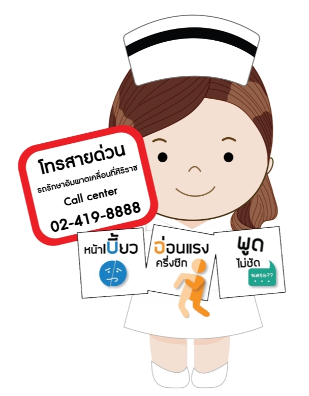 ถ้ามีอาการหน้าเบี้ยว อ่อนแรงครึ่งซีก พูดไม่ชัด โทรสายด่วนรถรักษาอัมพาตเคลื่อนที่ศิริราช โทร 1669 ทุกวันตลอด 24 ชั่วโมง